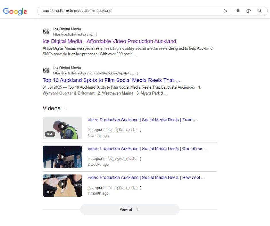 At Ice Digital Media, we practice what we preach. When you search “Social Media Reels Producing in Auckland” on Google, our own reels appear on the first page of results. That’s not by chance. It’s because we optimise descriptions with clear, keyword-rich phrases that Google understands.